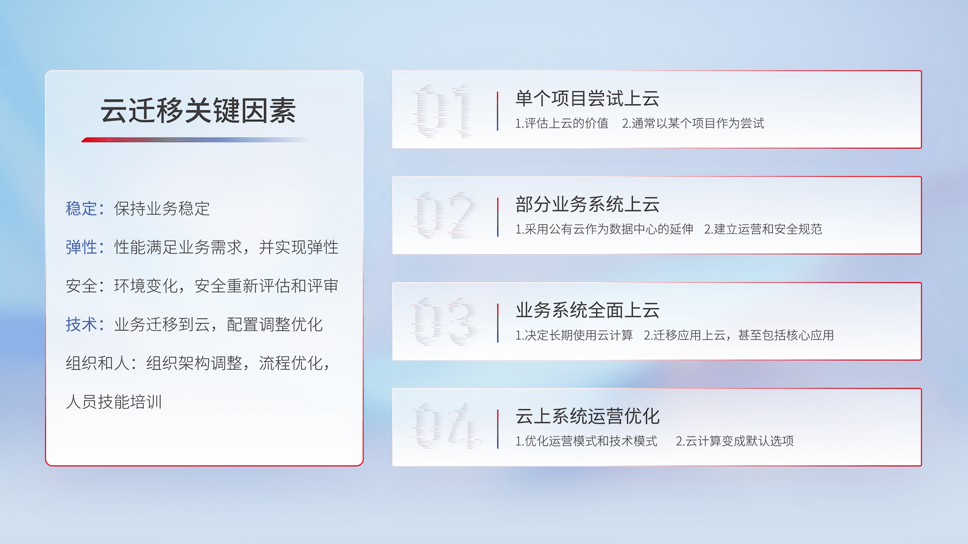 结合实际业务,,,,从规划设计、、、云平台选型、、云原生改造、、数据迁移、、、、集成交付,,,,迁移全过程为客户识别最佳上云路径,,做好风险识别管理,,设计网络架构、、身份权限、、、安全审计合规、、操作审计、、日志审计、、、、监控告警策略、、多站点容灾设计等,,,,对云上基础设施进行整体规划,,,提升IT治理水平,,,以满足弹性、、高可用、、高性能的需求。。