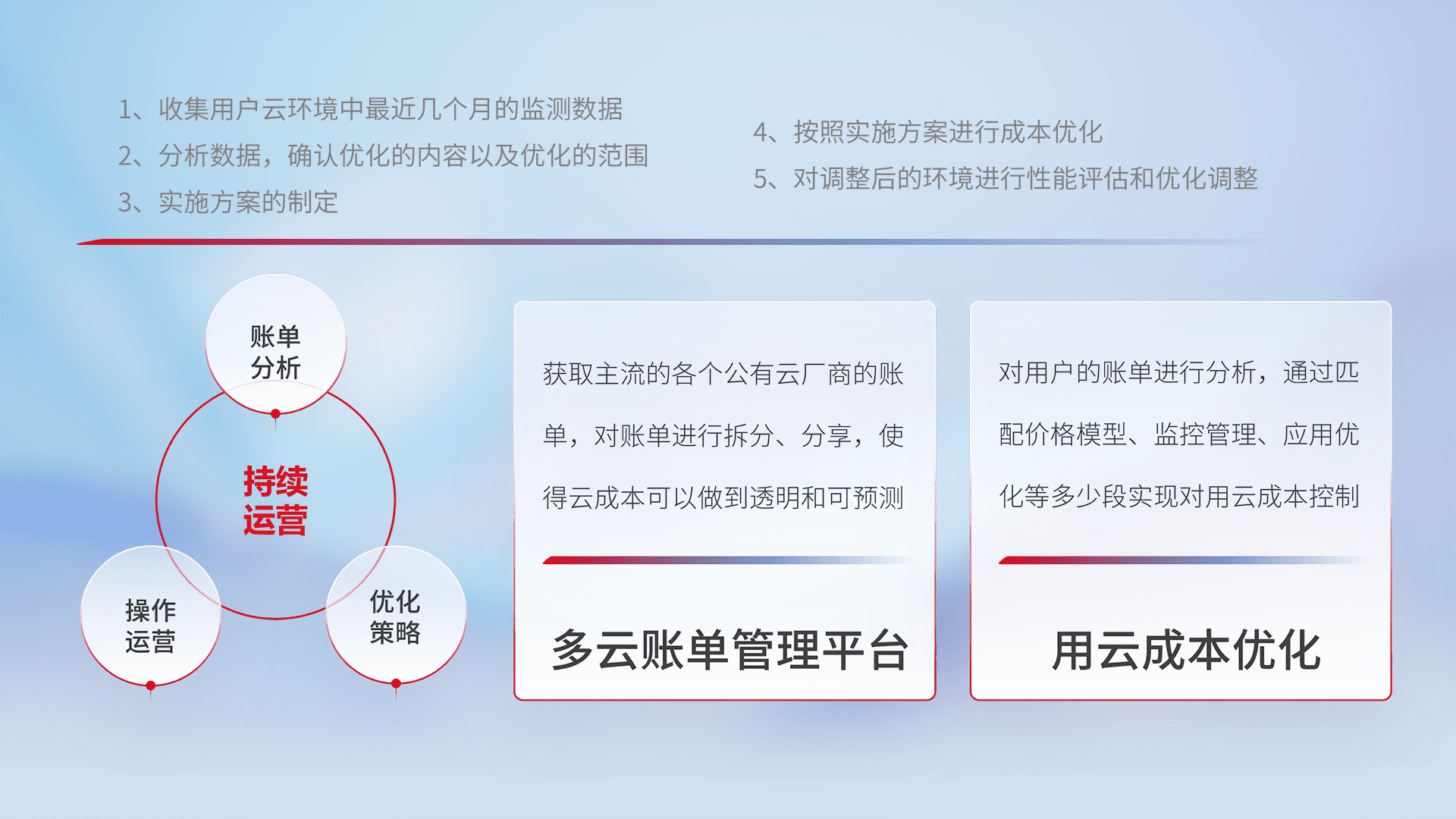 通过多云纳管,,,,以统一的资源数据模型把客户的云资源进行抽象和封装,,进而实现对多云资源的统一操作,,,保障云资源管理的可靠性、、稳定性与可用性。。。。量身定制化运维内容,,,,配置、、、开发运维、、、、补丁管理、、、备份、、、、监控、、、认证和访问管理、、、审计和日常巡检等,,,,保障在用云过程中的可靠度,,稳定度以及高可用率。。
