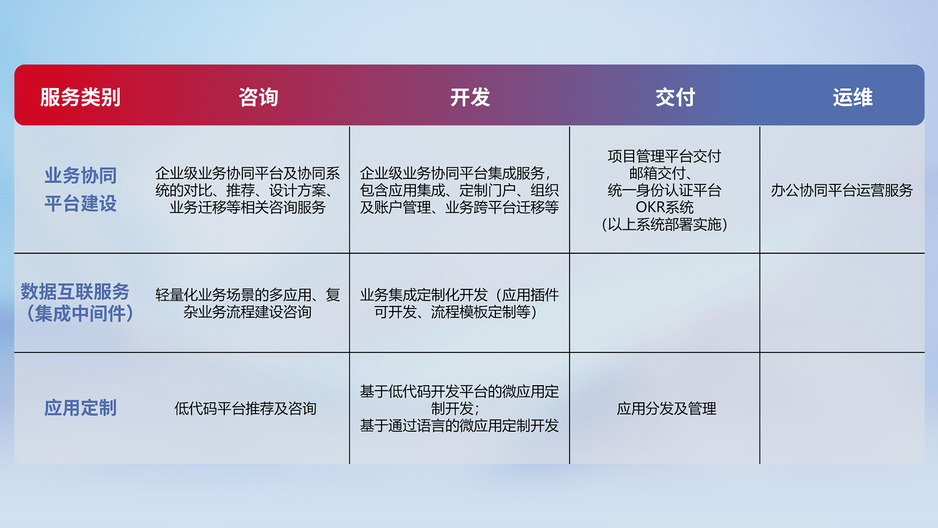 针对钉钉、、、企微、、IDaas等平台级产品提供产品的规划、、、方案、、、交付、、、定制化开发等服务,,实现如统一协同办公、、、、智能客户服务、、混合会议管理、、智能数据查询、、、、等业务场景,,实现数字化转型。。。。